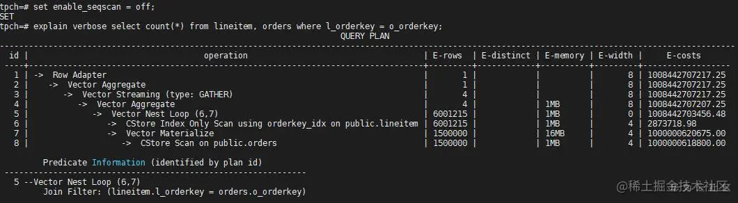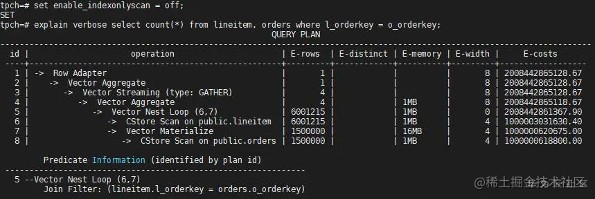 lineitem的扫描变成了Index Only Scan(因为l_orderkey的类型是int),而在orders表上仍然选择Seq Scan(因为没有其他路径),同时关联方式也变为了Nest Loop,因为Hash Join需要全表扫描数据(lineitem的Seq Scan已经被关掉了)。优化器的选择方式我们从代价(E-costs)一栏中也可以看出。再把Index Only Scan关掉,看看计划如何变化: