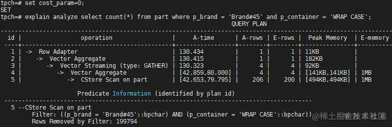 从估算出的行数(E-rows)和实际的行数(A-rows)对比可以看出,cost_param=0的不相关模型适合part表的p_brand和p_container列。