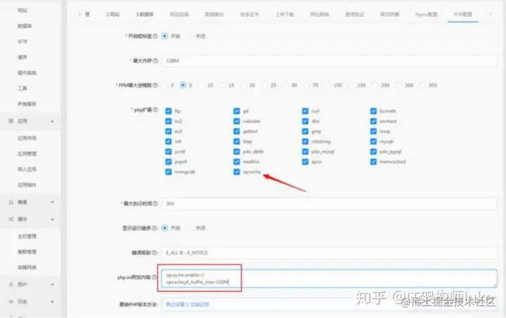 如果想要抢鲜感受 JIT 编译器带来的极速体验,请在 PHP 配置中勾选 opcache 扩 展,并在“php.ini 附加内容”中填入: