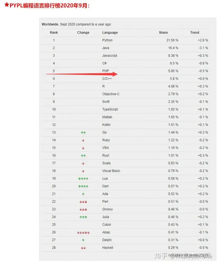 1.首先我们来谈论一下目前PHP所谓的“颓势”到底是什么?那么接下来我将会来揭秘为何一直在唱衰PHP。如果有一直关注过PHP发展的小伙伴应该就知道,PHP其实已经唱衰很多年了,但是事实上PHP的语言排名一直都在前十,基本上虽然有下降的趋势,但是一直都很稳固,对于优势的占有市场还是当之无愧的王者。