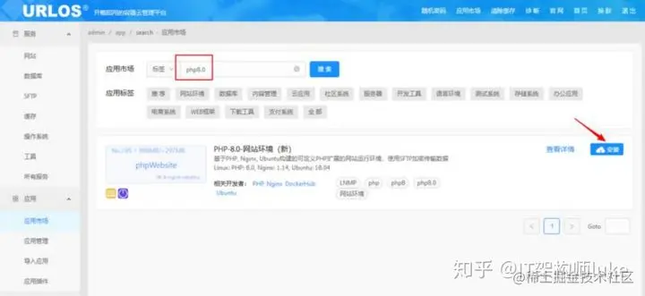 安装完成后登录 URLOS,在应用市场中搜索 php8.0,点击安装按钮: