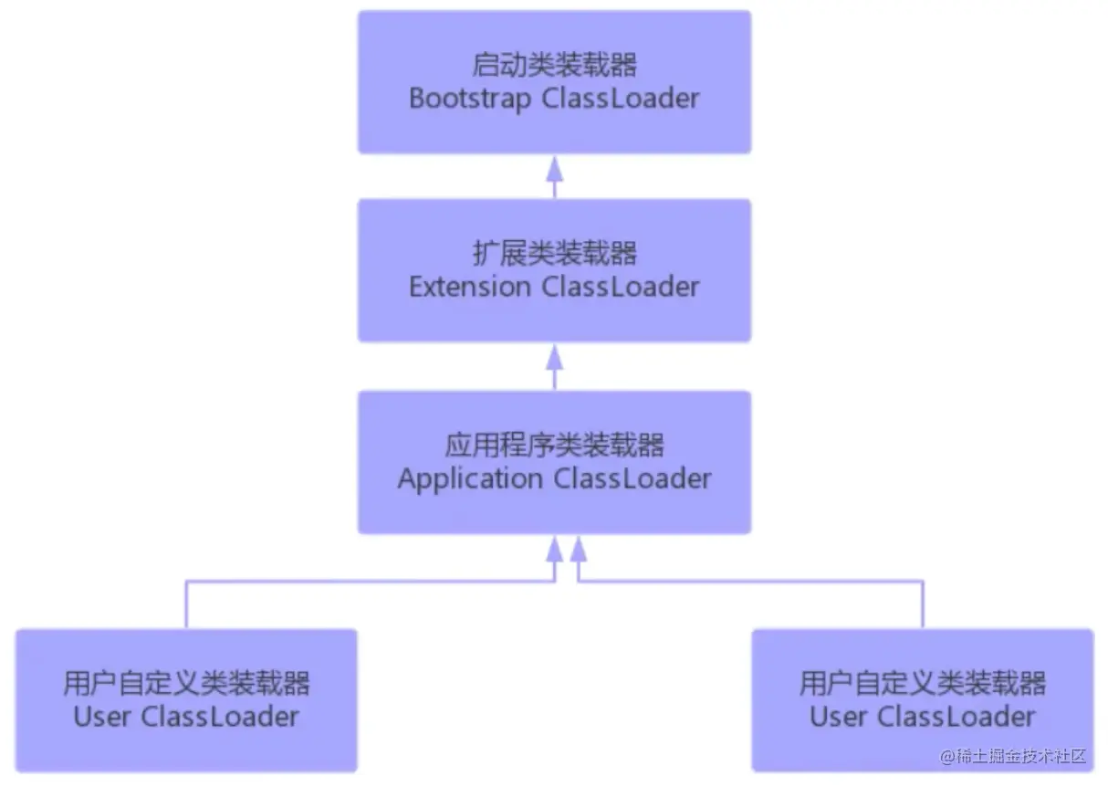 从概念上来讲,自定义类加载器一般指的是程序中由开发人员自定义的一类类加载器,但是Java虚拟机规范却没有这么定义,而是将所有派生于抽象类ClassLoader的类加载器都划分为自定义类加载器。无论类加载器的类型如何划分,在程序中我们最常见的类加载器结构主要是如下情况: