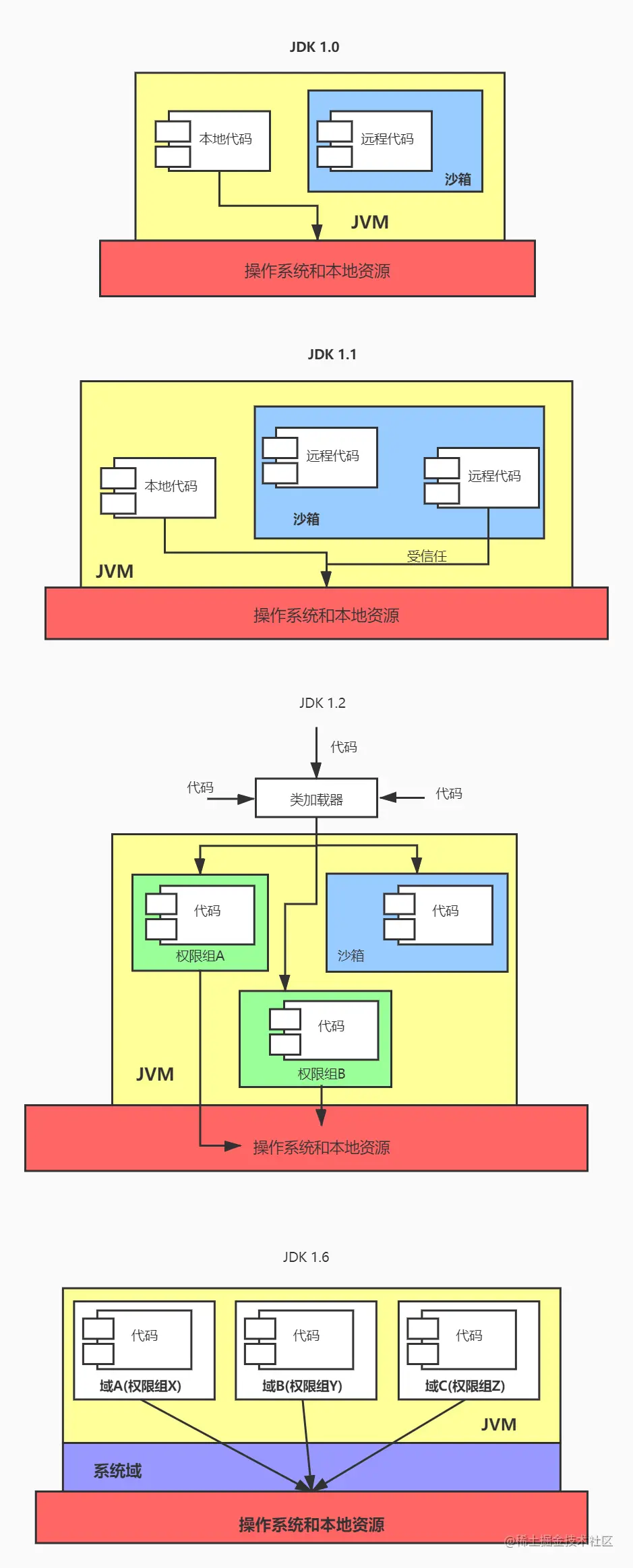 因此在后续的Java1.1版本中,针对安全机制做了改进,增加了安全策略。允许用户指定代码对本地资源的访问权限。如下图所示JDK1.1安全模型