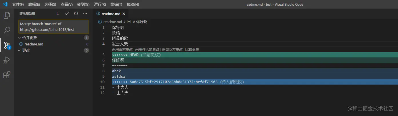- 有冲突的话,解决冲突后,再执行提交代码的流程
