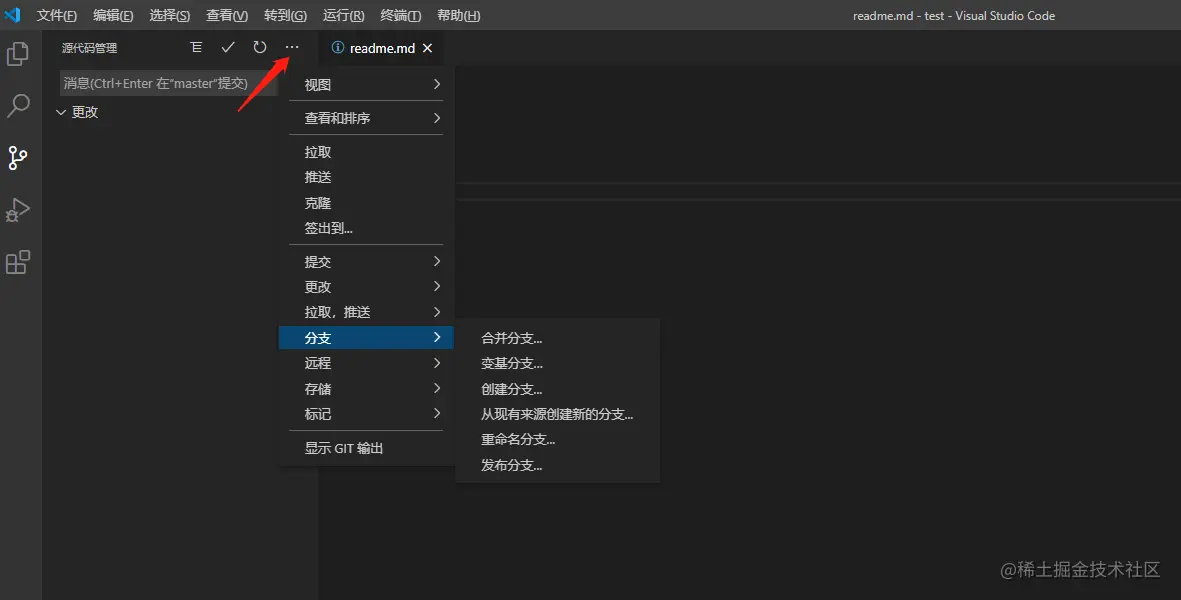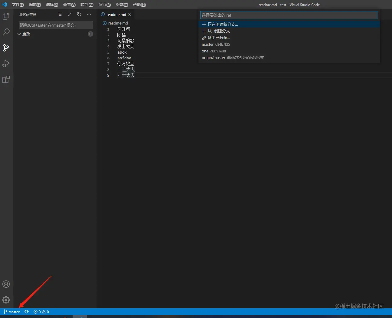 点击左下角的master分支,会出现弹窗进行切换分支的操作