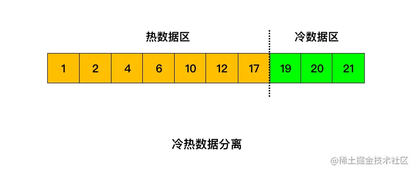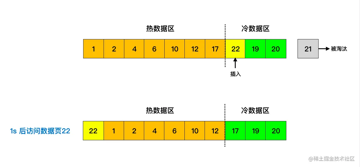 也就是将 LRU 链表分为两部分,一部分为热数据区域,一部分为冷数据区域。