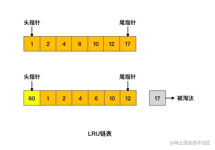 如下图所示,如果要访问的数据在 60 号页中,60 号页不在缓冲池中,此时加载进来放到链表的头部,同时淘汰掉末尾的 17 号缓存页。