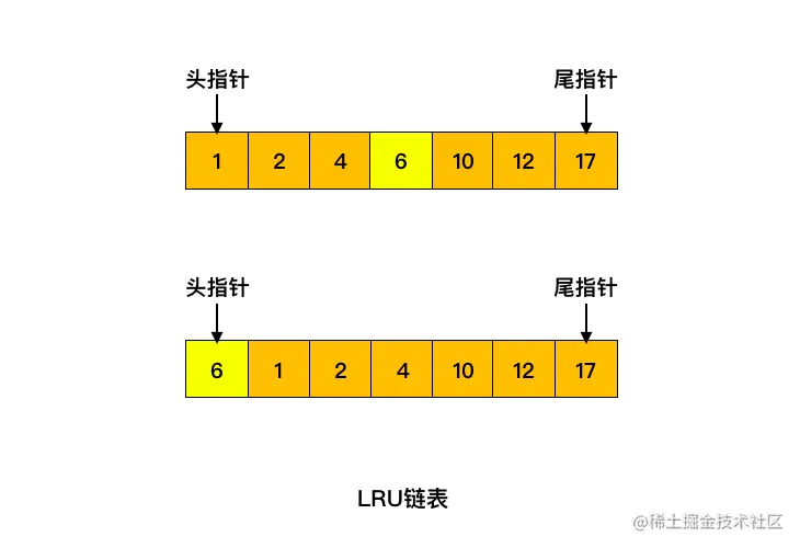 如下图所示,如果要访问的数据在 6 号页中,则将 6 号页放到链表头部即可,这种情况下没有缓存页被淘汰。