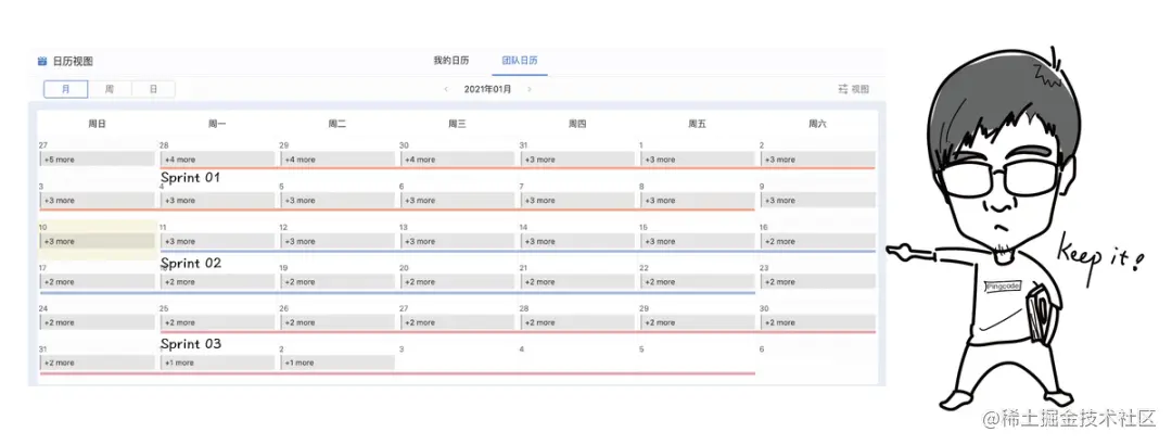 在第二周周五下午5点,开回顾会议。每个人都说一说团队做的好的和不好的地方,我们一起确定改进方案。