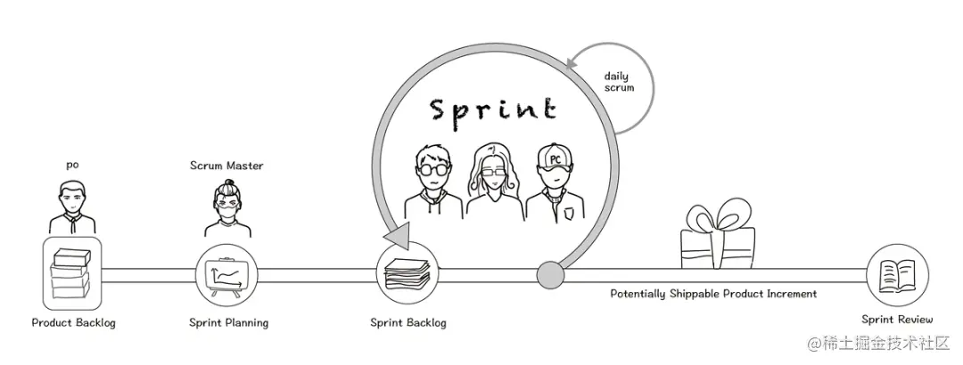 由PO维护产品待办列表 Sprint周期为2周 Scrum各个会议的时间、地点、内容代码提交方式故事点的标准 ……