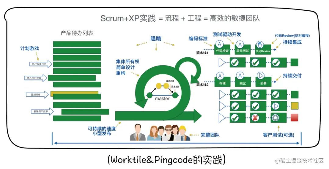 我们不断的发现自己的问题,不断的改进。随着一个又一个的Sprint,们发现可以应用一些优秀的工程实践提升研发效率,比如简单设计、测试驱动开发、持续集成、持续部署等等。我总结我们的实践如下图: