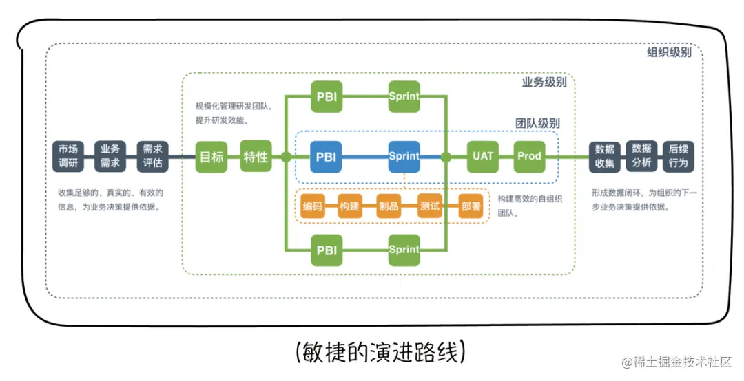 组织级别的敏捷更加关注的是通过充足的市场调研确定方向,然后通过产品的真实数据验证方向,为下一步决策提供依据。