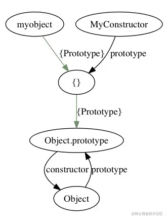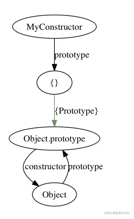 由于 new 操作会将 myObj 的[[Prototype]]设置为 MyConstructor.prototype,而 MyConstructor.prototype 为一个普通空对象,因此 MyConstructor 的[[Prototype]]就和 Object.prototype 关联了起来