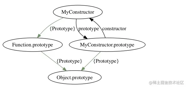MyConstructor.prototype是一个自动创建的对象,这个对象又有一个 constructor 属性指回 MyConstructor。需要注意的是,只有函数对象才拥有 prototype 属性,因此,只有函数对象才拥有 constructor 属性- 上图的 MyConstructor 的[[Prototype]]指向 Function.prototype, 而不是 MyConstructor.prototype。