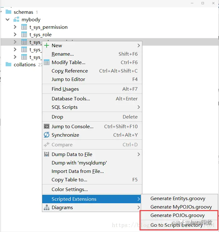 连接好了如上图所示,可以看到自己的数据库和表,选择一个表右键,网上教程一般到这里结束,都是选择说Generate POJOs.groovy,然后在弹出窗口选择需要生成的文件夹所在即可。
