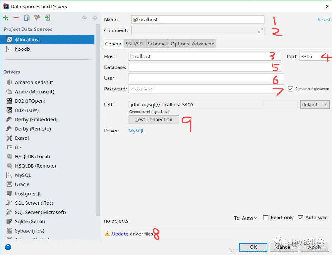 9、填写自己的数据库连接url,然后可以点击9所在按钮进行测试连接,本地连接失败检查是否开启了mysql服务