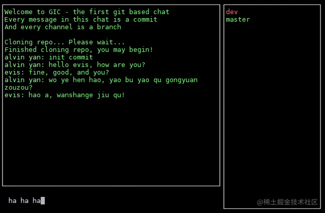 聊天启动之后,我们就会看到一个很简陋的文字版的聊天界面了。在这个界面里,左边是主聊天区,右边是 git 仓库的全部分支。这些分支就相当于不同的聊天对象,里面的聊天内容是不相同的。