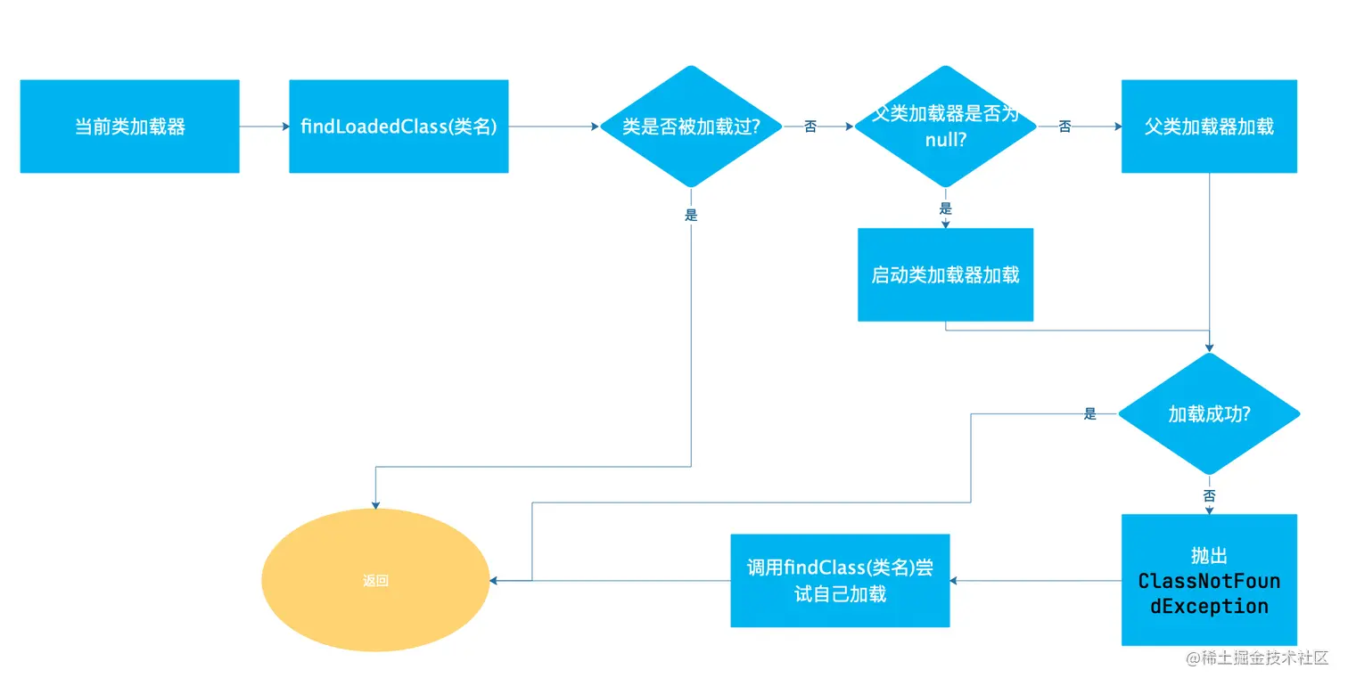 类加载器会使用loadClass方法来加载类(loadClass方法没有被重写的流程)