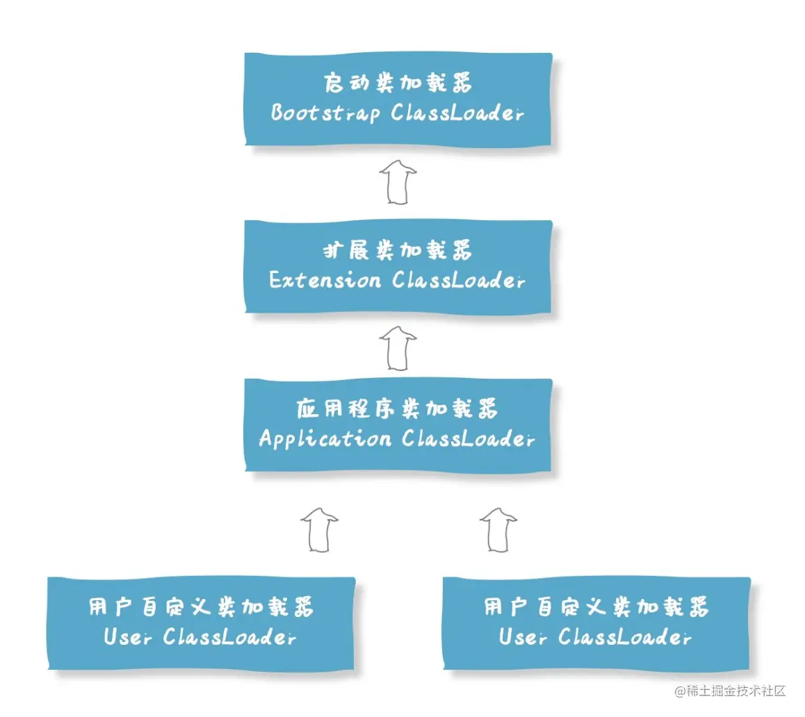 用户自己的类默认都是通过应用程序类加载器加载的, 在应用程序类加载器加载之前, 会尝试通过启动类和扩展类加载器加载, 相当于两个父亲先加载, 所以叫双亲