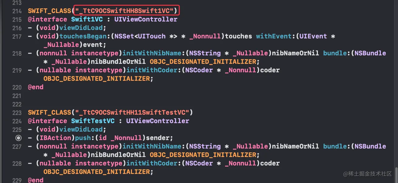 进去查看会发现 里面有我们写的Swift两个控制器的 类 个人认为应该是编译器已经帮我们做好了就是凡是在Swift里面调用的方法他都转好了
