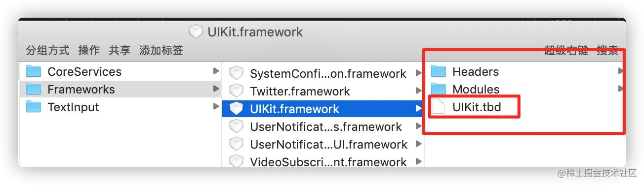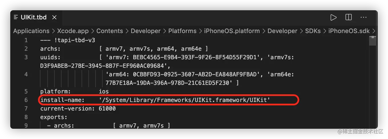UIKit.framework之后,会发现并没有Mach-O文件,只有一个UIKit.tbd文件,这个UIKit.tbd文件里面就有存放UIKit的Mach-O文件路径,它就是文本文件,直接打开就行。 -