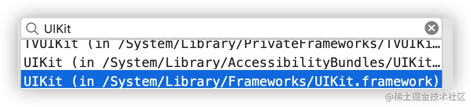 UIKit的,我们可以看路径,找到我们之前得到的路径/System/Library/Frameworks/UIKit.framework,匹配上了就是它了。点击