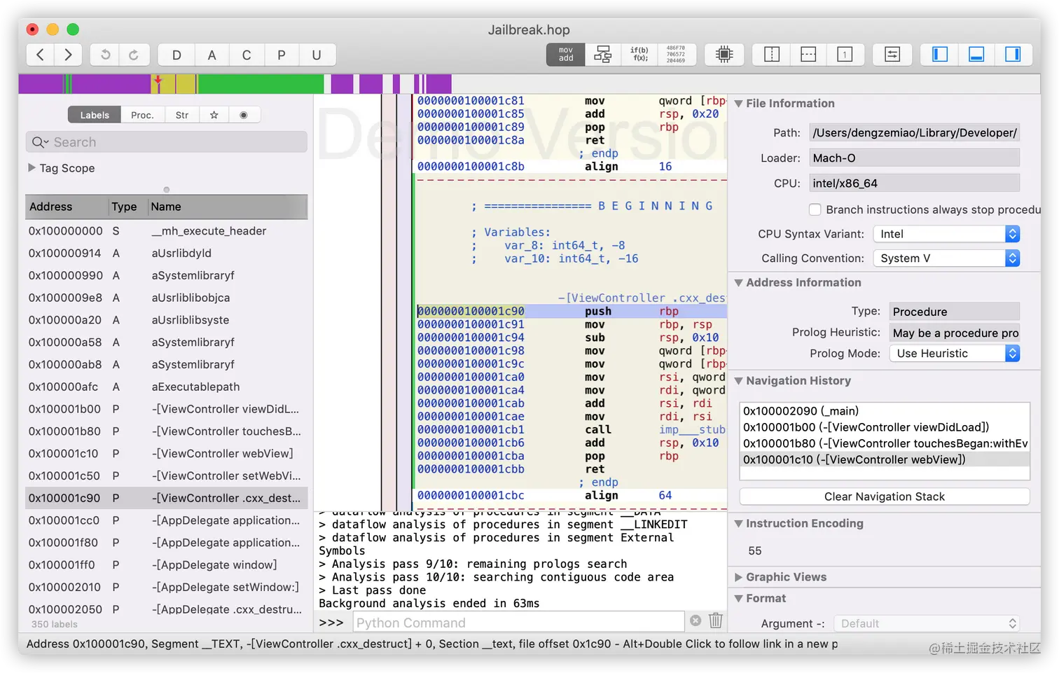 OK就行了,然后就得到了Mach-O文件汇编代码,如果包比较大,解析需要点时间,使用也会有点卡,可以提早进行解析。