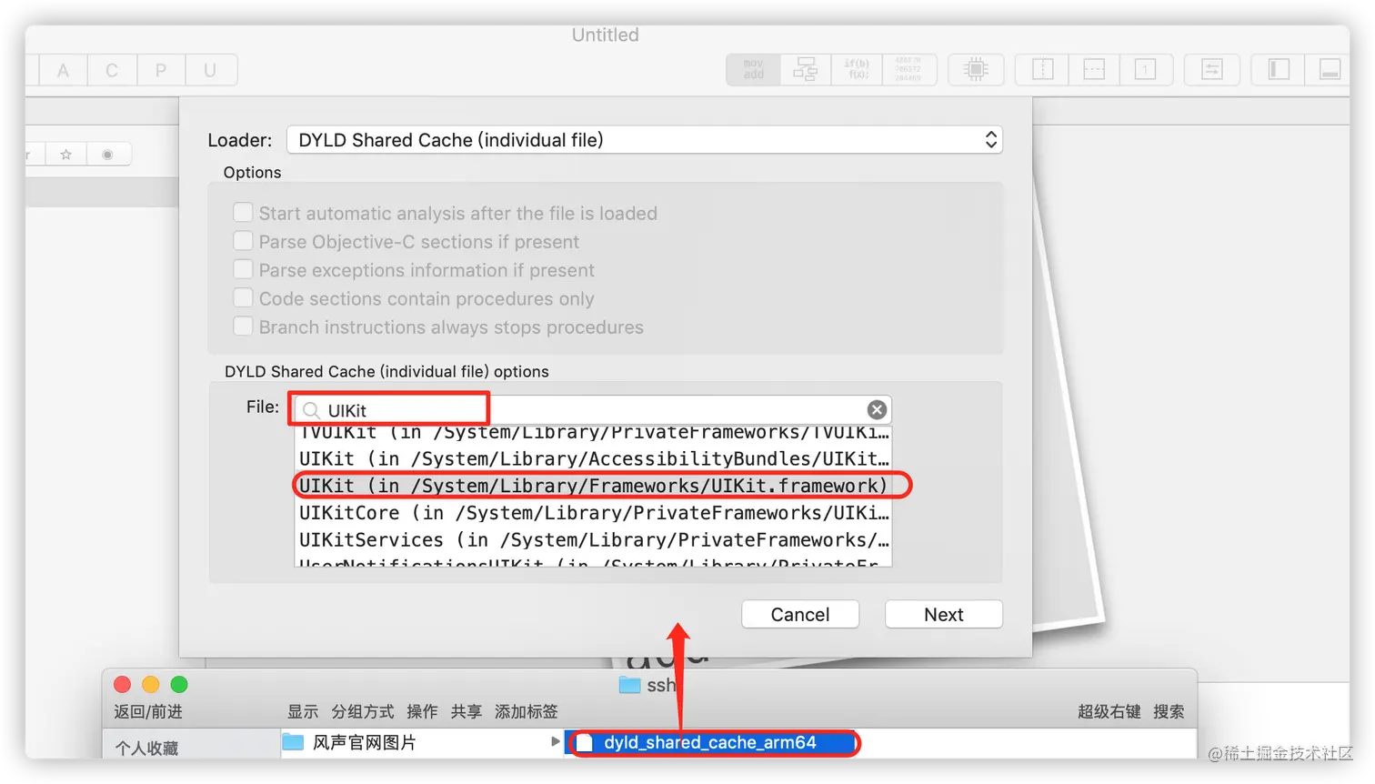 Hopper Disassmbler里面,发现会是DYLD Shared Cache (individual file),这个时候我们就需要通过下面的搜索找到UIKit了,并选中它,点击Next。搜索之后,由于有很多都是