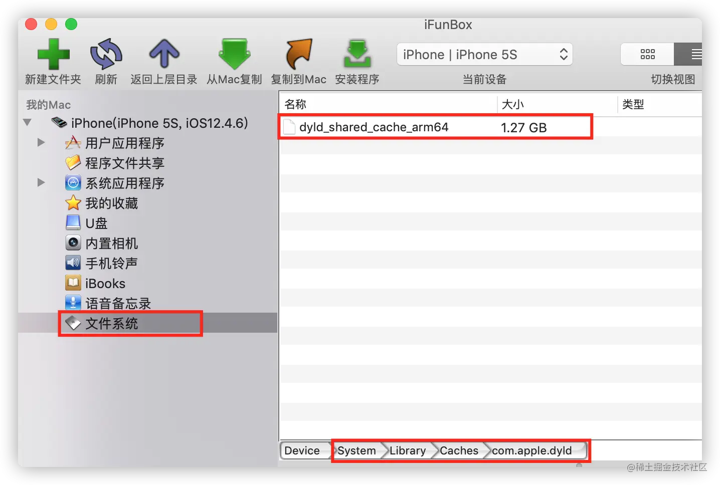 UIKit的Mach-O在哪个文件,可以找到它看看,找到目录之后发现是有个dyld_shared_cache_arm64的文件,我们把它导出来到桌面。 -