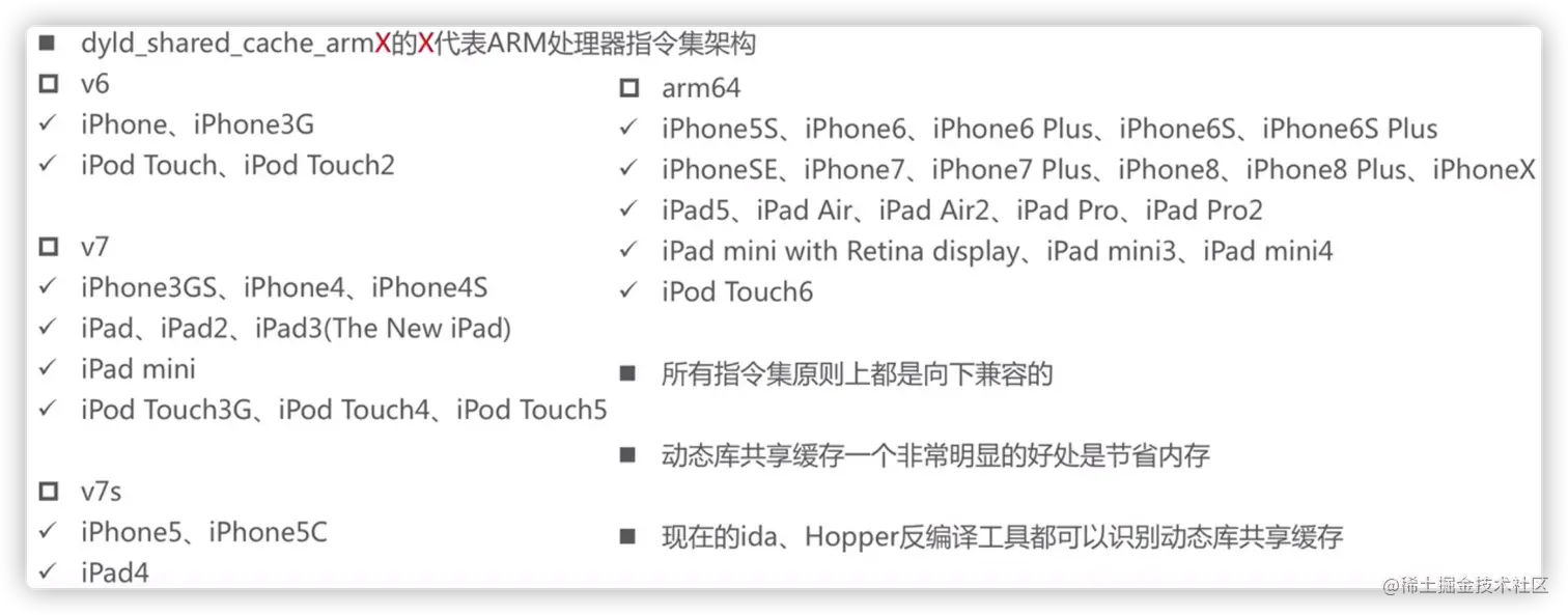 iOS3.1开始为了提高性能,绝大部分的系统动态库文件都打包存放到了一个缓存文件中( dyld shared cache ),缓存文件路径:/System/Library/Caches/com.apple.dyld/dyld_shared_cache_armXdyld_shared_cache_armX的X代表ARM处理器指令集架构,可能是..._armv6、..._armv7、..._arm7s、..._arm64等,所有指令集原则上都是向下兼容的,高等级支持所有低等级的。 -