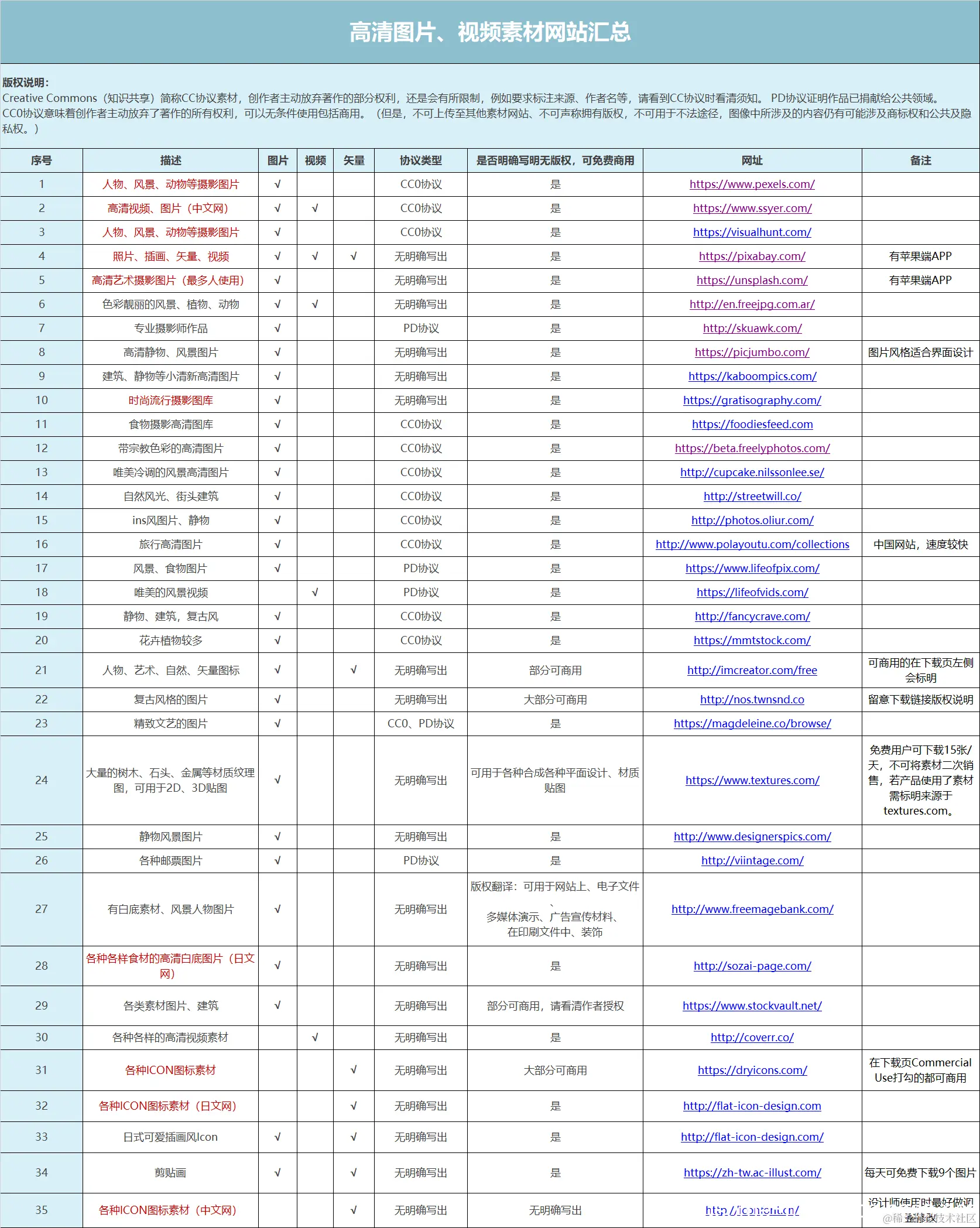 整理了一份实用性爆表的表格图像、视频、矢量……共35个网站,表中含有网站简介和素材类型,做PPT必备啊~