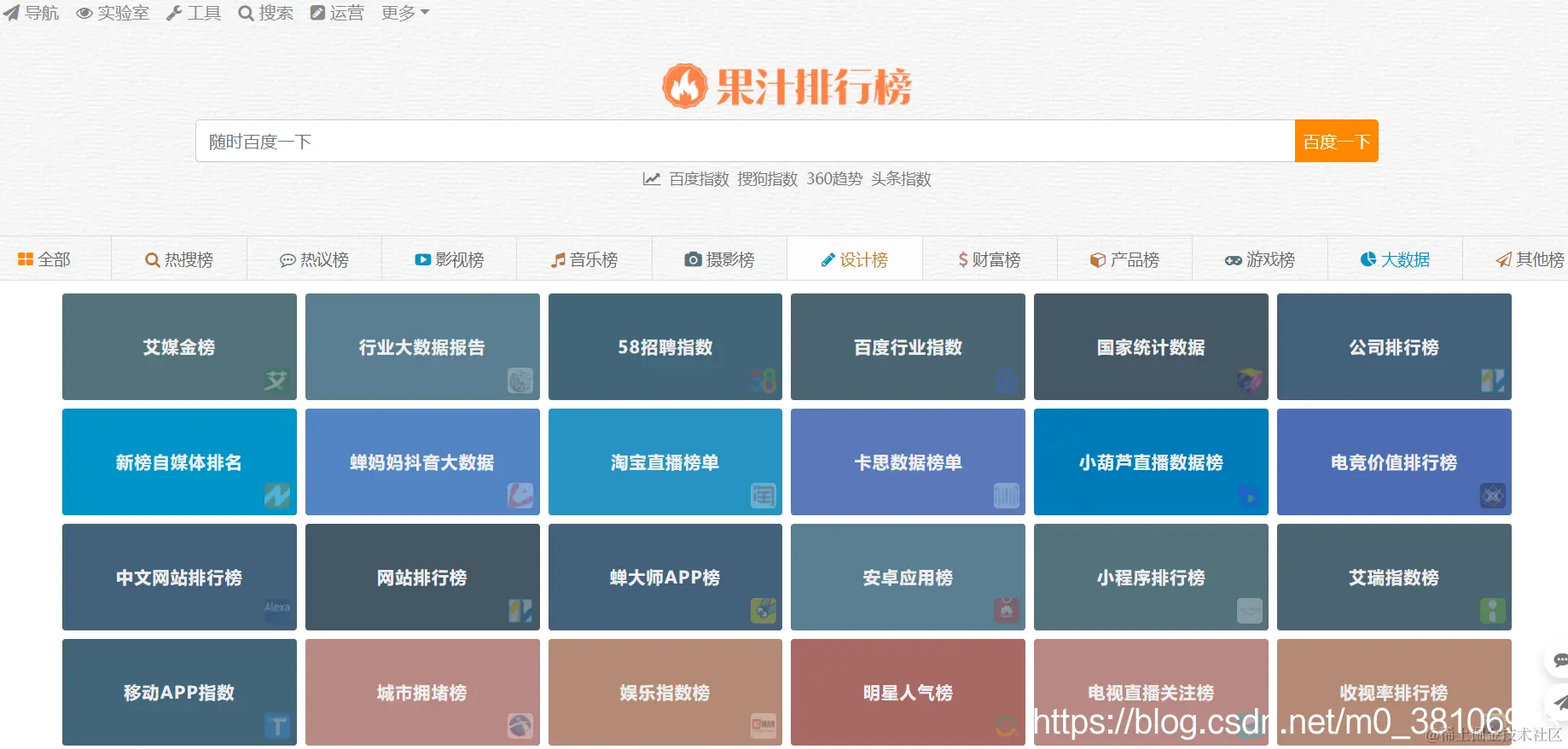 果汁排行榜是一个集合了各类排行版的网站。分类有:热搜榜、热议榜、影视榜、音乐榜、摄影榜、设计榜、财富榜、产品热销排名、游戏榜、大数据等。无论是程序员,还是产品经理或者运营人员,利用好这个网站,都可以快速查询到某一分类的最热门的内容和产品。