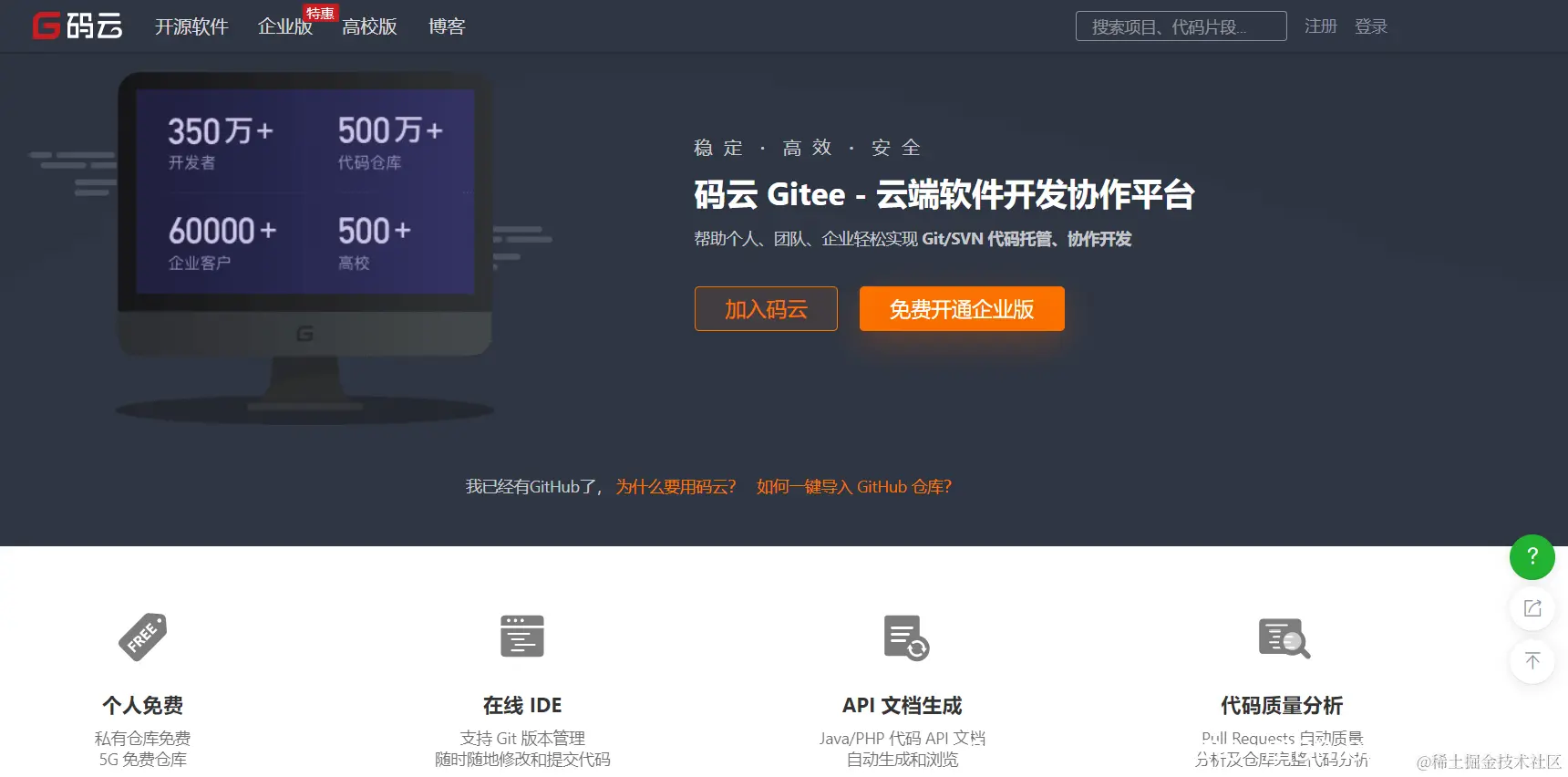 码云是 OSCHINA.NET 推出的代码托管平台,支持 Git 和 SVN,提供免费的私有仓库托管。目前已有超过 350 万的开发者选择码云。