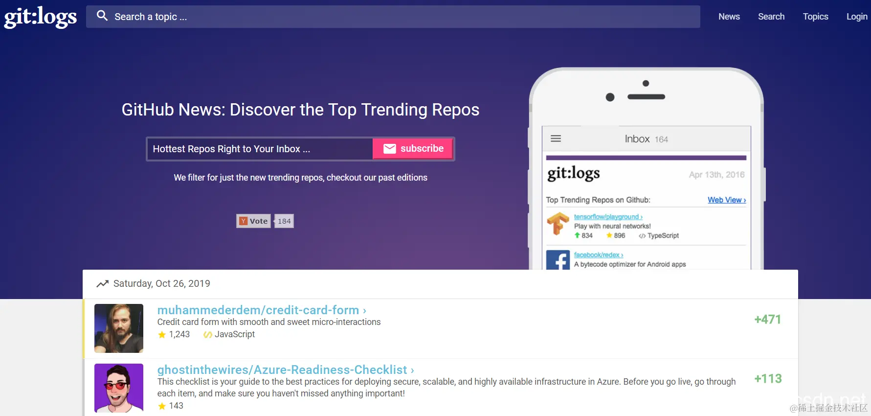 GitLogs 是GitHub网站的内容搜索引擎,可以帮助工程师们快速的找到相关的项目,同时也提供最新的开发项目、开发新闻、相关主题推荐等资源,支持邮箱订阅文章,每天都可以收到GitHub网站上的最新内容。