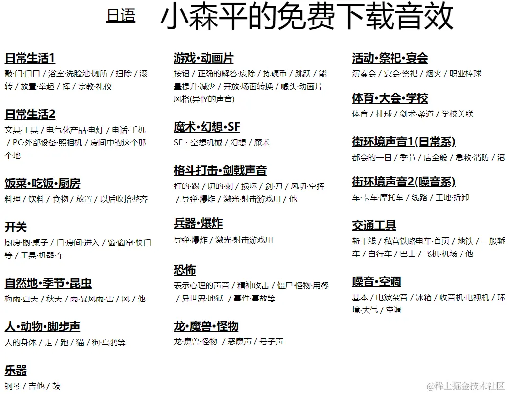 一个日本小哥维护的网站,里面有大量的音效可以免费下载使用,包括日常生活、游戏、音乐等,做视频的伙伴的福利。