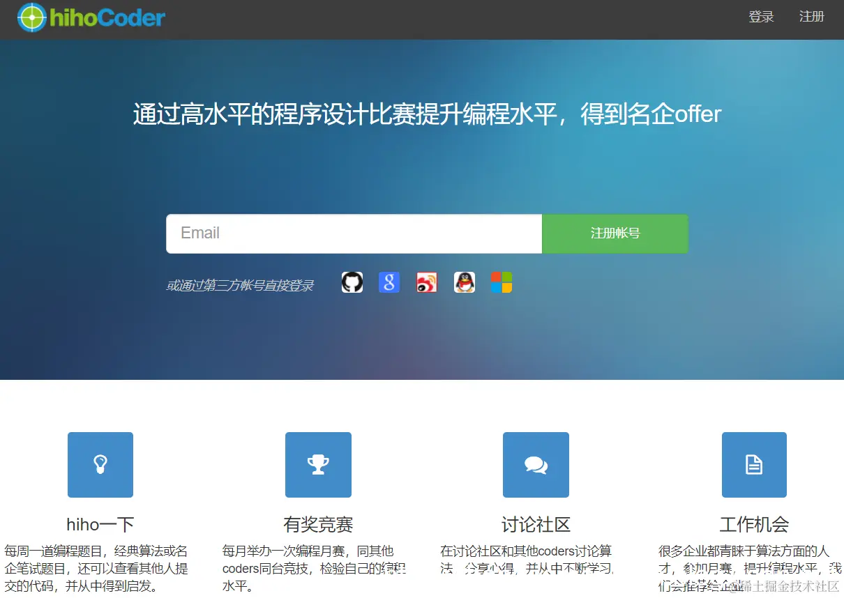 网站的技术团队来自于原北大 POJ 的开发团队,至于 POJ 会在后面的篇章中介绍,反正膜拜就完事了。一些知名的大厂比如微软、百度、腾讯、网易等会在上面举办在线编程比赛,风格倒是和 ACM 比赛类似。hihoCoder 每周有周赛,每月有月赛。周赛是一道题,题目比较难但是极有意思,可以很好的拓宽自己的解题思路,月赛就更厉害了,题目均出自北大等一流高校玩 ACM 的菊苣出题,通过这个的检验可以迅速定位到自己真实的水平,同时了解自身在解决问题过程中的不足。