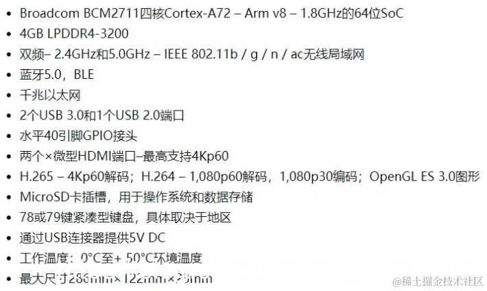 另外树莓派400配备4GB内存、千兆以太网、蓝牙5.0和802.11ac Wi-Fi,micro HDMI端口可输出高达4K/60Hz的信号,还有两个USB 3.0端口和一个USB 2.0端口。电源则通过USB-C端口提供,有一个microSD卡插槽用于存储系统,还有一个GPIO接头用于连接各种其他设备。