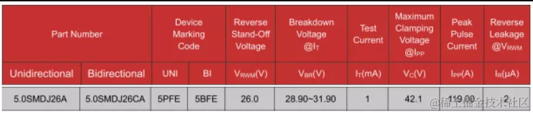 根据计算结果,可以选用5.0SMDJ26A这个TVS,由于这个TVS用在电源端口,结电容和漏电流可根据具体实际电路选用。