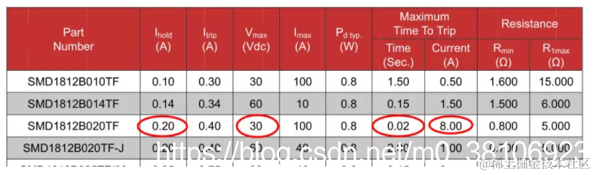 - 最大动作时间Trip越短越好,如 SMD1812B020TF,当通过 PPTC 的电流为 8A 时,PPTC 的动作时间应不大于 0.02s;