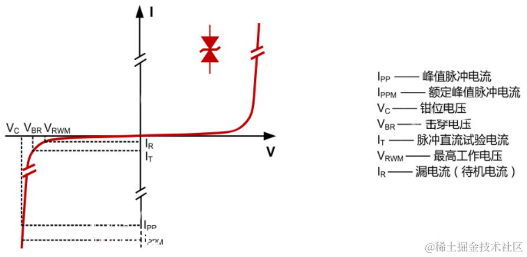 击穿电压,指在 V-I 特性曲线上,在规定的脉冲直流电流It或接近发生雪崩的电流条件下测得 TVS 两端的电压。测试的电流It一般选取10mA左右,施加的电流的时间不应超过400ms,以免损坏器件,VBR MIN 和 VBR MAX 是 TVS 击穿电压的一个偏差,一般 TVS 为±5%的偏差。测量时,VBR 落在VBR MIN和VBR MAX之间视为合格品。