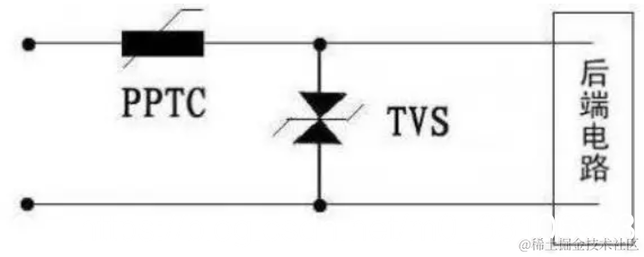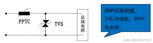 当外加电压达到TVS的击穿电压时,TVS开始导通,阻抗变低,流过的电流不断增大。随着电流的不断增大,PPTC的阻抗不断增大,不断发热,最终PPTC变成断路失效,整个后级电路得以保护。所以要实现电路保护,需要2个前提: