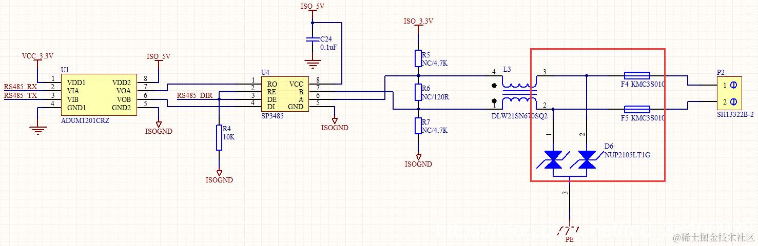 如下图所示是RS485的过压保护电路,RS485芯片的工作电压一般是5V,能够承受的极限电压一般是12V。通常设备的工作电压一般是12V或者24V,如果误将24V电源电压接到RS485A-B线上且没有过压保护,大概率RS485芯片会物理损坏。TVS管专门用于瞬间过压保护,无法应付长时间的过压,不到0.5STVS就会因过热烧毁,后级电路就会失去保护。