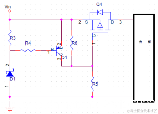 Vin正常输入电压时,稳压管没有反向击穿,R3,R4电流基本为0。PNP三极管的Vbe=0,即PNP三极管不导通。PMOS管Q4的Vgs由电阻R5,R6分压决定,PMOS管导通,即电源正常工作。
