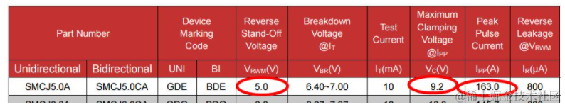 因此,最终TVS选择Vc=9.2V,Ipp=163的SMCJ5.0A。