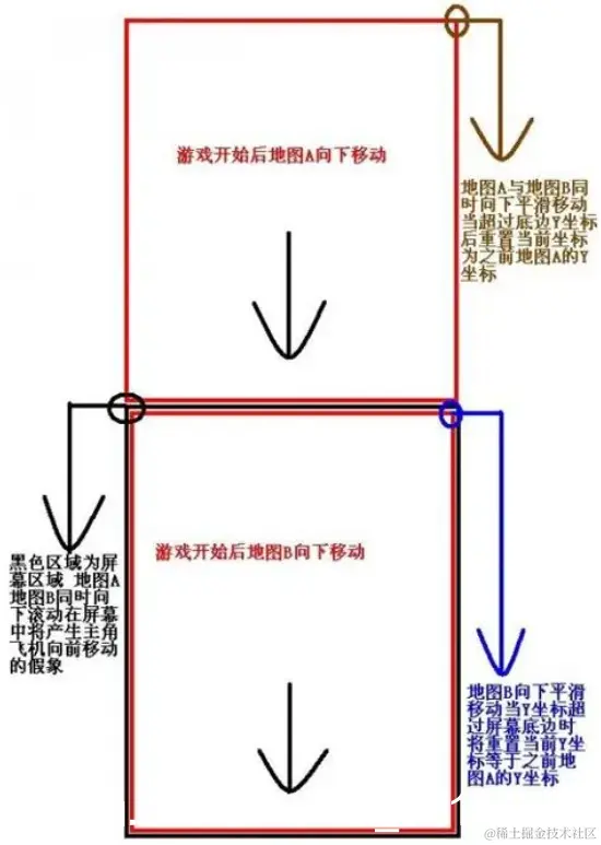 如下图所示地图图片在屏幕背后交替滚动,这样就会给玩家产生自己控制的飞机在向前移动的错觉。