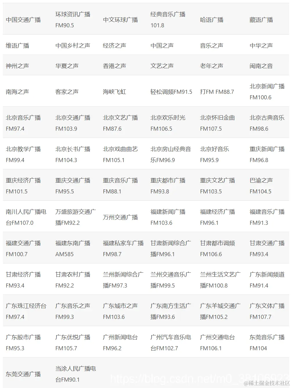 可支持广播电台频道如下所示: