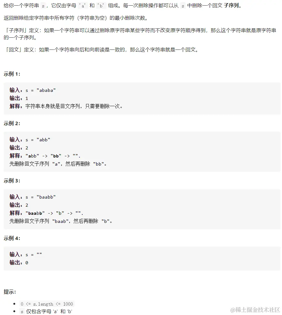 3、当整字符串不为回文序列时,最多是删除两次,一次删除所有a,一次删除所有b,返回2。