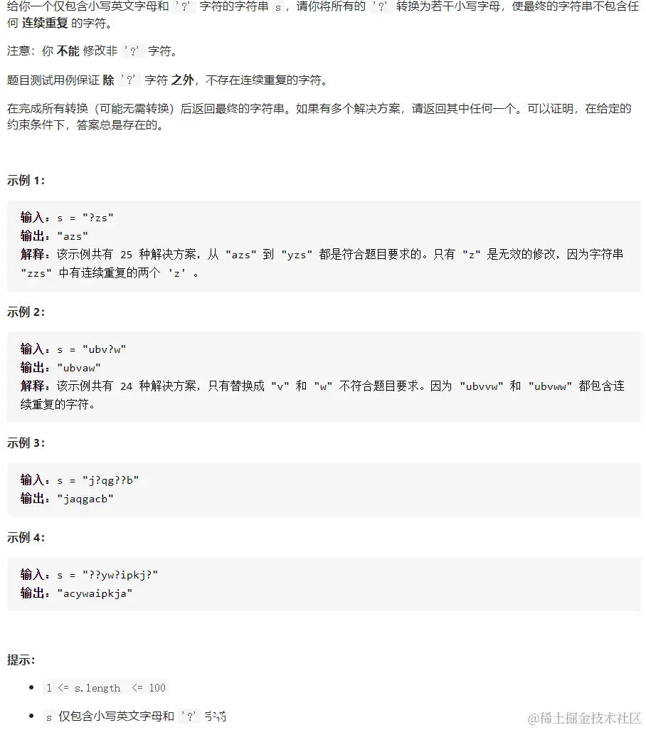 遍历字符串,如果当前字符为'?',用'a'开始尝试,直到找到一个字符,满足前后字符都与当前字符不同,进行替换。