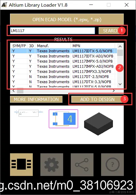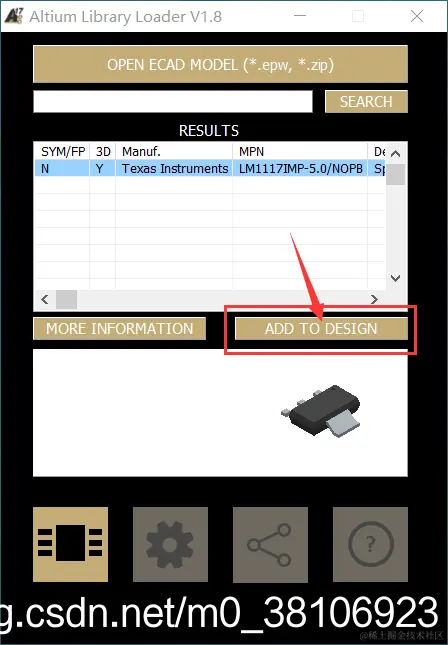 举个例子,我需要查找元器件:LM1117的原理图封装和PCB封装,在列表中选择所需元器件,点击ADD TO DESIGN,即可添加到Altium Designer中(网络延时时间较长),如下图所示:
