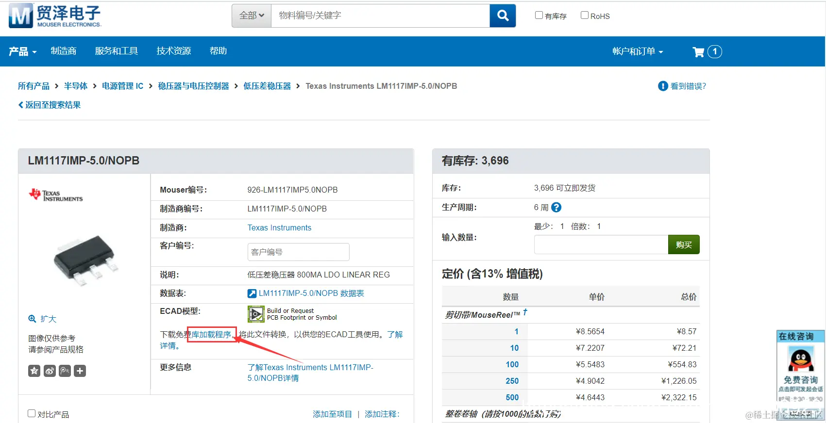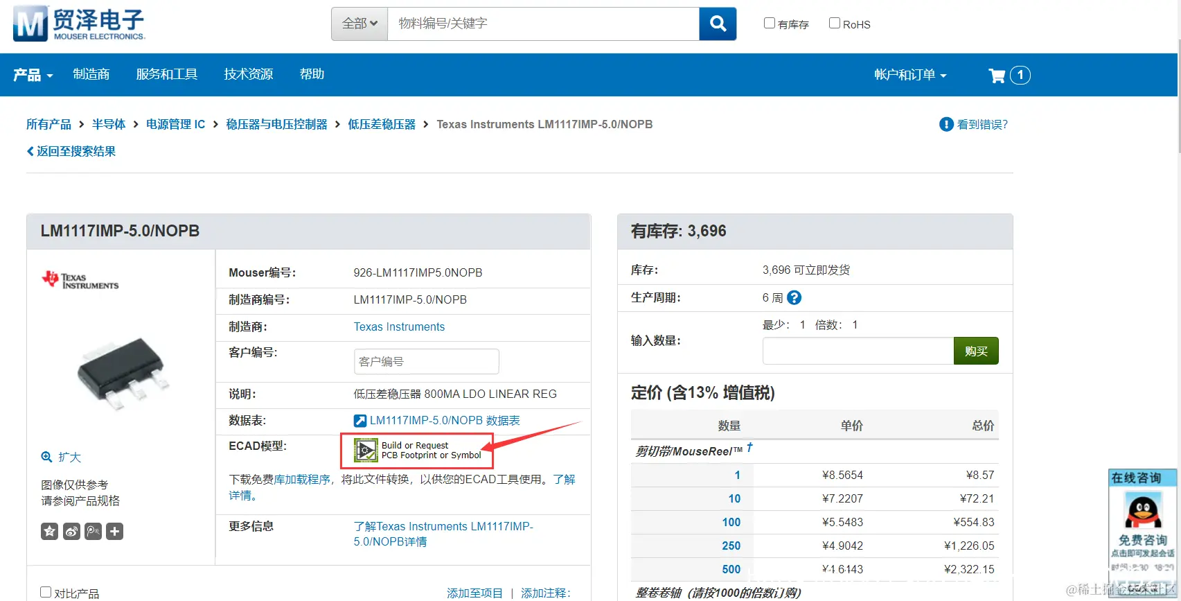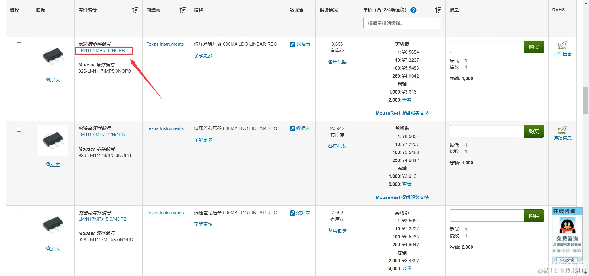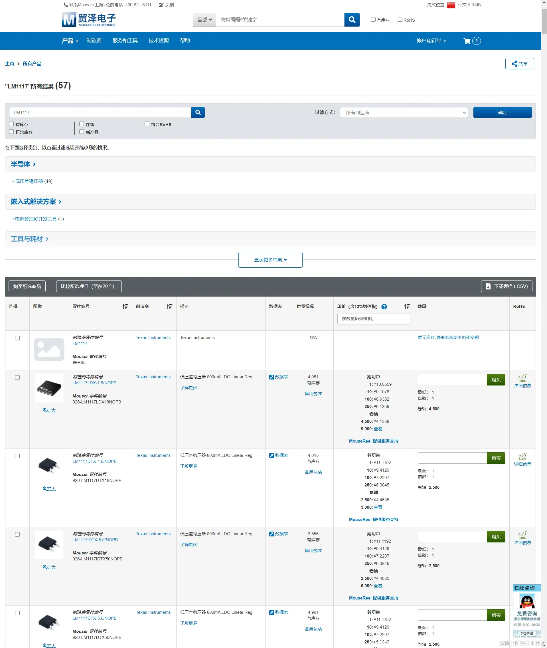 第1步:在贸泽电子查找该元器件,可以看到不同厂商和价格的该类元器件,如下图所示: